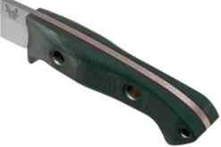 The Benchmade Bushcrafter 162 is, as the name already suggests, a fixed knife made for bushcraft purposes. The handle is enhanced with a remarkable profile that feels incredibly comfortable in hand. The handle is made from green G10 that, in combination with the red vulcanized spacer, is held together with the help of a pressed titanium ring. A remarkable and effective construction that also enables you to attach the knife to something. To, for instance, turn your knife into a spear. The S30V powder steel blade runs throughout the entire handle (full-tang) and is rock-solid. This knife is great for the more demanding tasks.