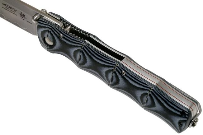 The Mcusta MC-0201G Minari Shinra Maxima is a large and stylish Mcusta pocket knife. Perfect for anyone who prefers slightly larger gentleman’s knives. The stunning micarta handle stands out. It is enhanced with what Mcusta calls a bamboo pattern. This means, quite literally, that the handle is shaped like a piece of bamboo. It doesn’t only look great, it also offers enough grip.