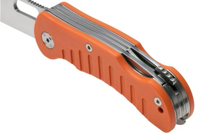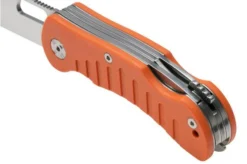 The PUMA IP Hunting Folder Orange III is a modern pocket knife specially designed for hunting. This pocket knife is made by hand in Spain. The orange handle is made from G10, a sturdy material made from fibreglass fabric with an epoxy base. It has a finger groove, which makes it very comfortable to hold, and a stainless steel hole especially for your lanyard. This knife has three different blades: a wide knife, a slim knife and a saw. They are all held in place by a strong back lock. The three different blades are made from 440A steel, a stainless steel that retains its sharpness well and is easy to sharpen.