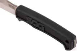 The SOG Field Knife is a very affordable fixed knife. The rubber thermoplastic handle feels great in hand and offers enough grip. Even in wet circumstances or while wearing gloves. The blade is made from stainless 7Cr17MoV steel and is razor-sharp. The hollow grind of the blade is combined with a very subtle recurve. As such the SOG Field Knife is amazing to use.