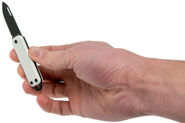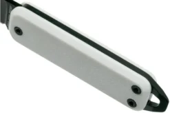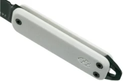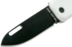 The James Brand Elko is a keychain pocket knife with a sleek design. The Elko clearly has the minimalist design we have seen on many The James Brand knives. The handle is made from sleek off-white G10. The blade has an interesting droppoint-like shape with an open nail-nick.