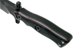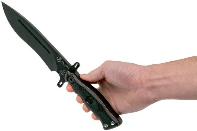 The TOPS Knives Operator 7 Blackout Edition is a large, grandiose knife, made for survival. In terms of blade thickness and finish, TOPS has really gone above and beyond. With a blade of 18.5 cm and at just under 8 mm thick, this knife sure makes an impression. Add to that the confidence that the large baffle plate offers and you know that this knife is made for very intensive use.